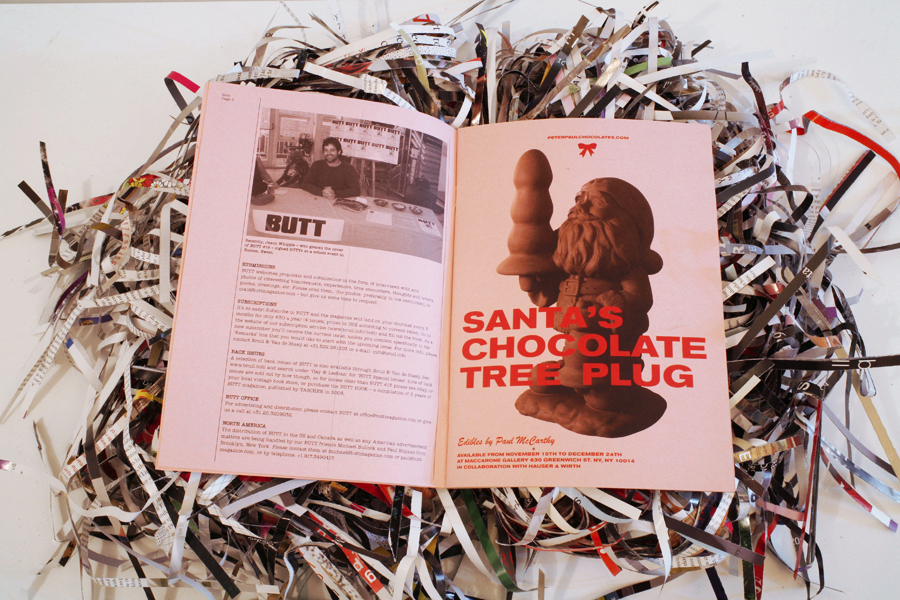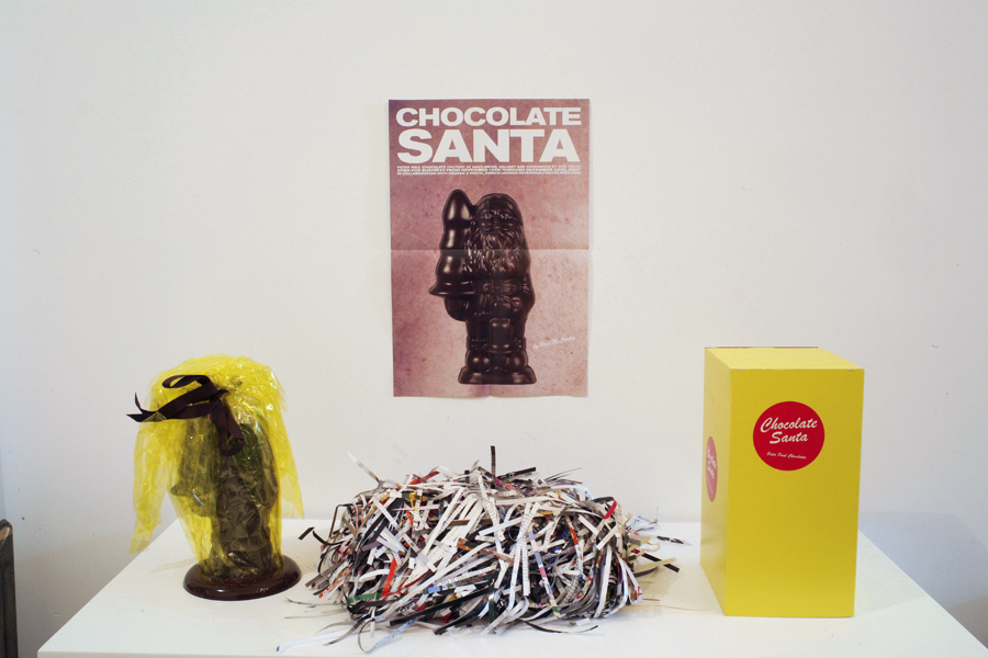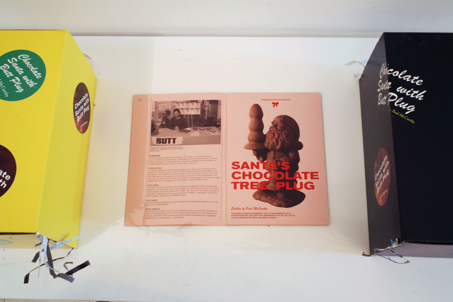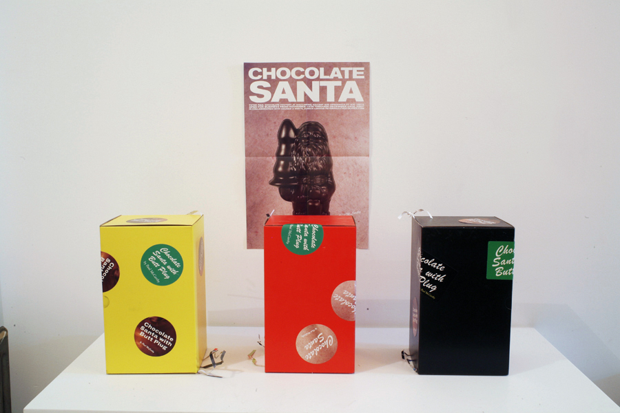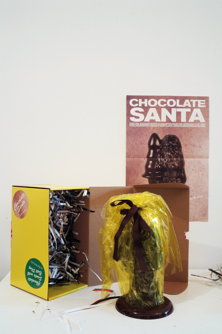 Edible chocolate figurine by Paul McCarthy for Peter Paul Chocolates, a temporary chocolate factory and retail store opened by McCarthy at Maccarone Gallery, in conjunction with Hauser & Wirth, for the 2007 holiday season. The figurine, originally referred to as "Santa With Tree And Bell," is 10" high and is made with 14 oz. of Guittard semi-sweet dark chocolate and comes in decorative wrapping with a display podium.